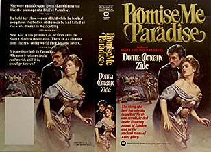Here is a romance taking place in the midst of the Mexican Revolution, early in the 20th Century. The models are enacting a scene in the book in which the hero is holding the heroine as a human shield while backing away from the bodies of the men he had killed at a state dinner in Mexico City. The peasant guerrillas shown fighting at the bottom of the painting are symbolic of the Mexican Revolution. It is a pity that this was eliminated from the cover, I thought this section was well painted.