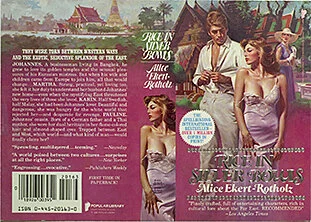 This is the first cover of three books by Alice Ekert-Rotholz that I painted. Europeans leave for foreign lands, in this case Bangkok,Thailand and continue their intrigues and romance. This is one of the earlier buxom illustrations done while men still dominated as Art Directors In the illustration I painted a typical Thai statue in the center to define more of that culture, but the Art Director chose instead to repeat a partial image of the front cover clinch on the spine to encourage sales.